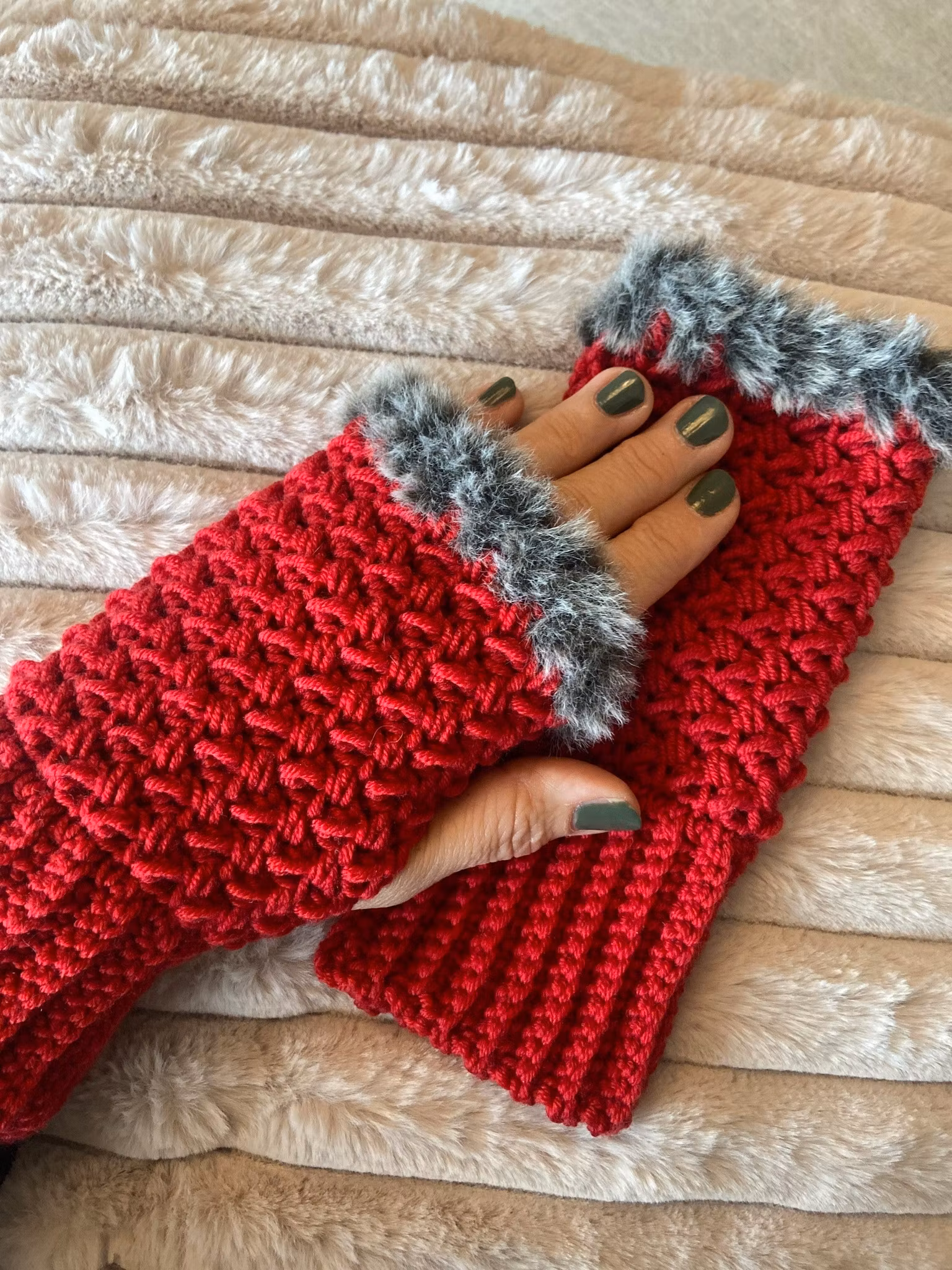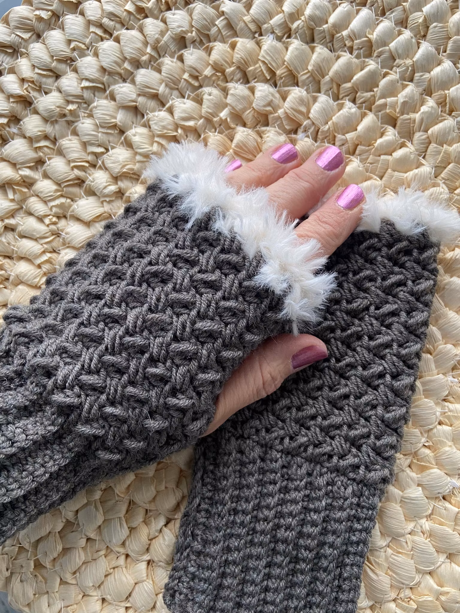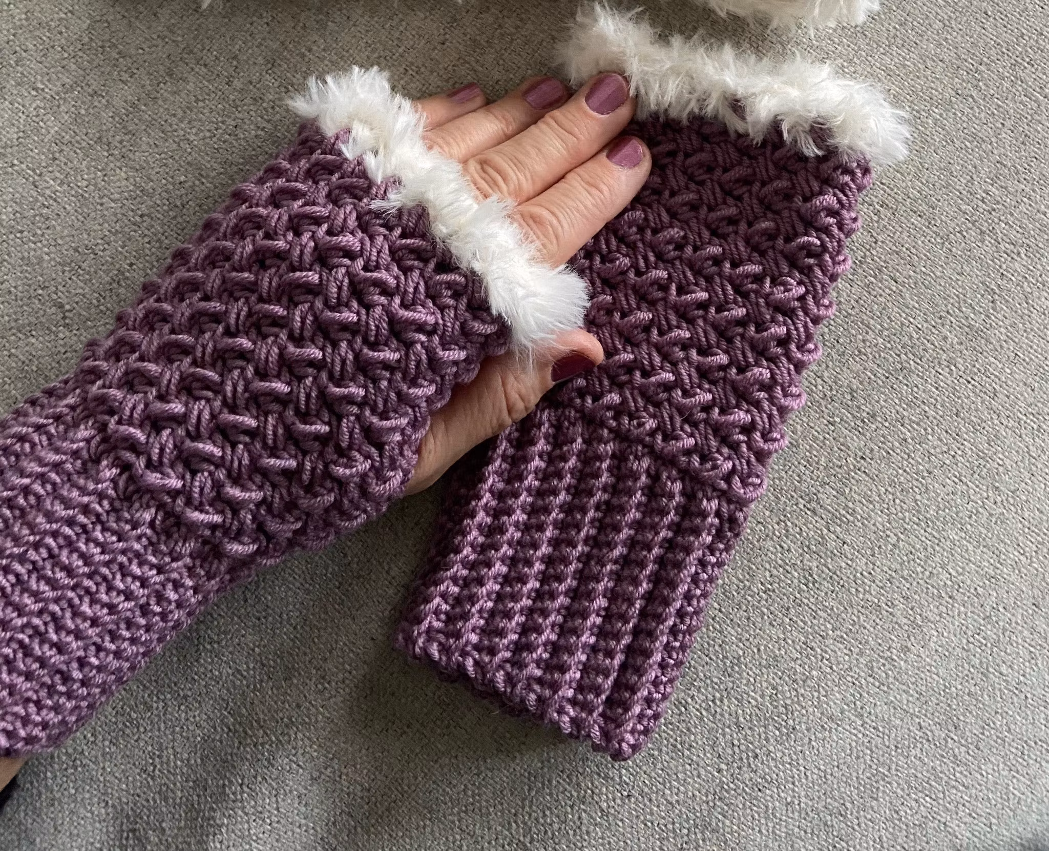 Handledsvärmare/torgvantar virkade i mjuk merinoull med pälskant längd ca 20cm
