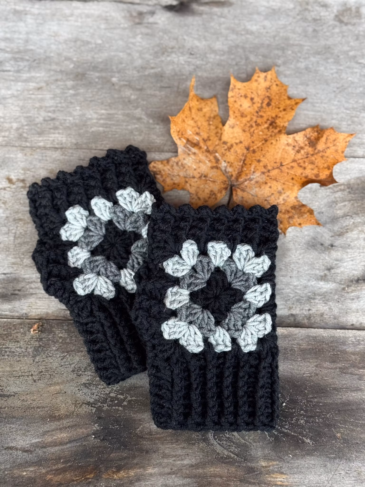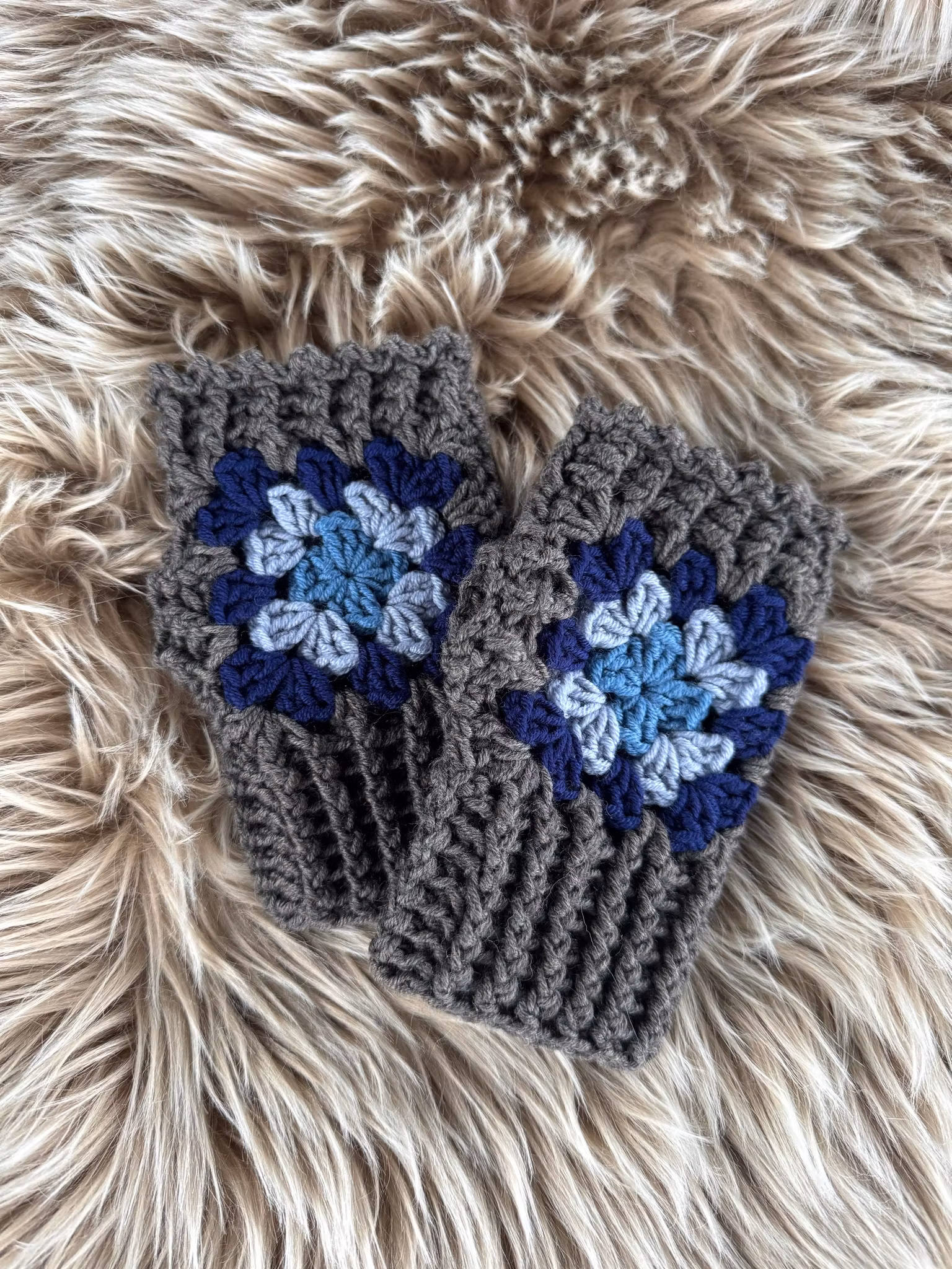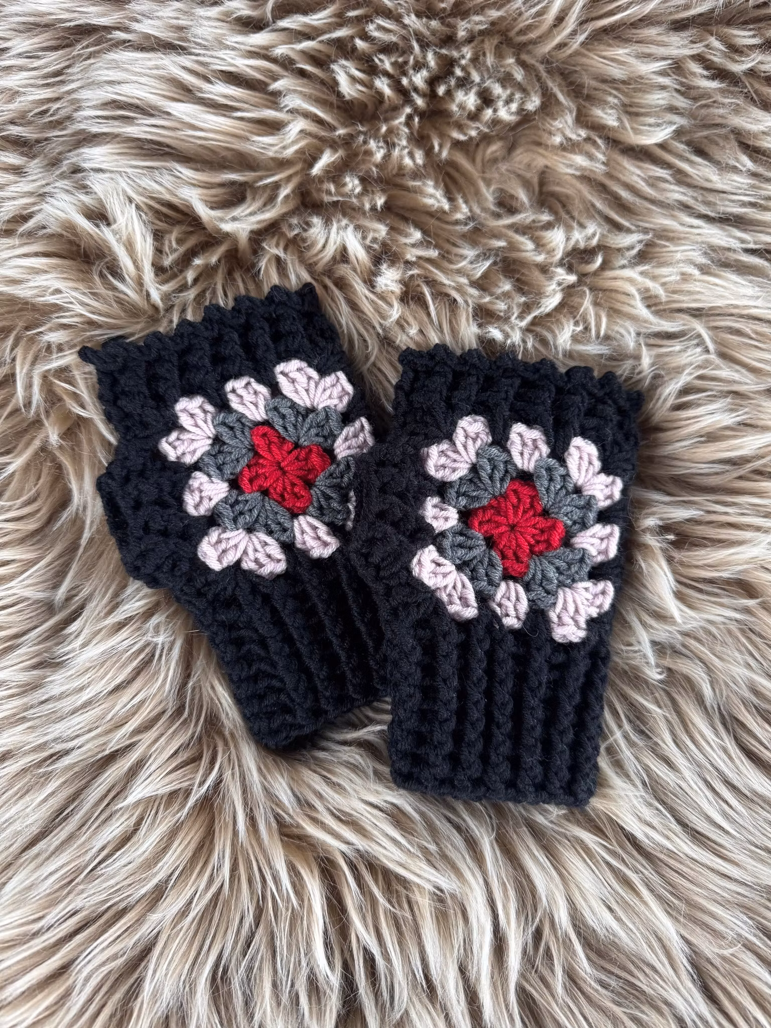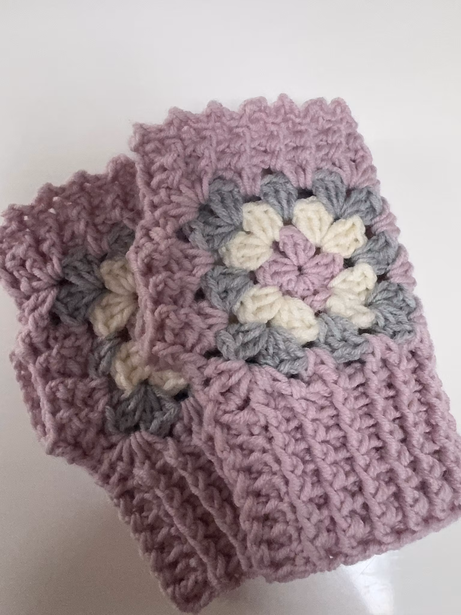 Torgvantar/handledsvärmare i kortare modell med mormorsrutor virkade i mjuk merinoull längd ca 15,16cm