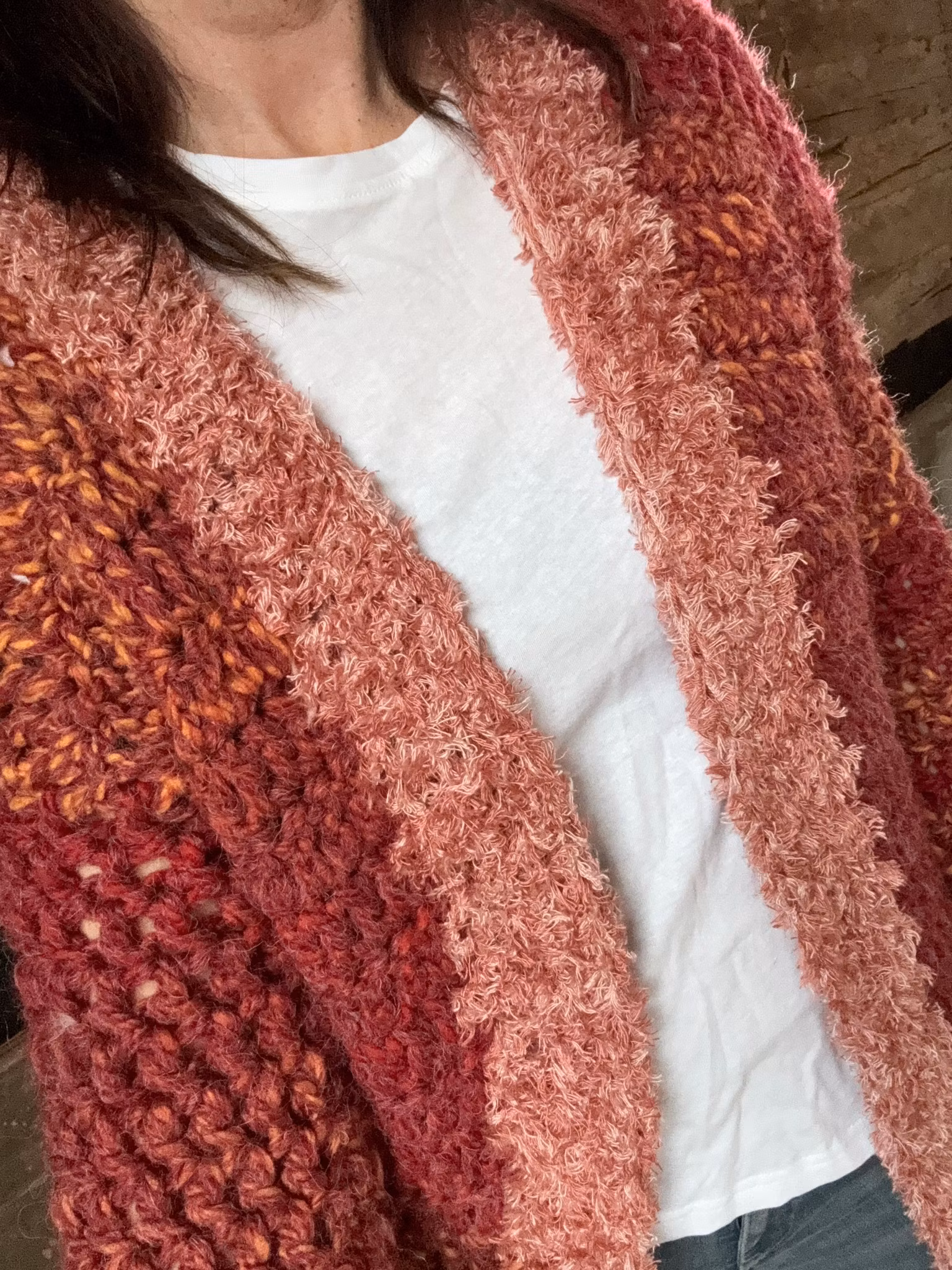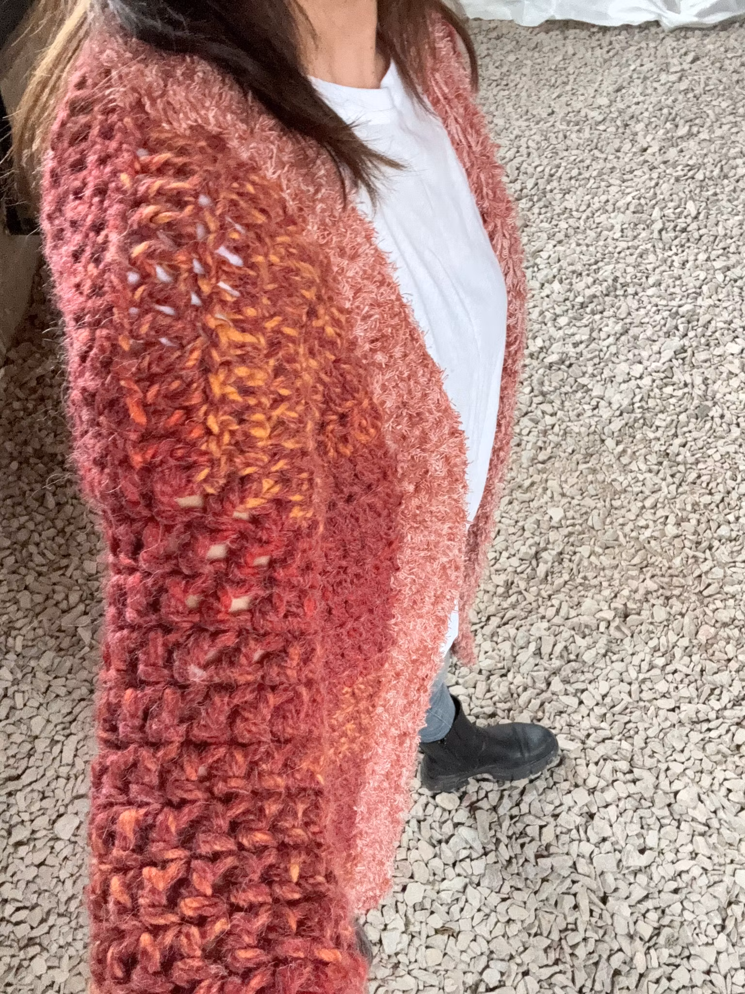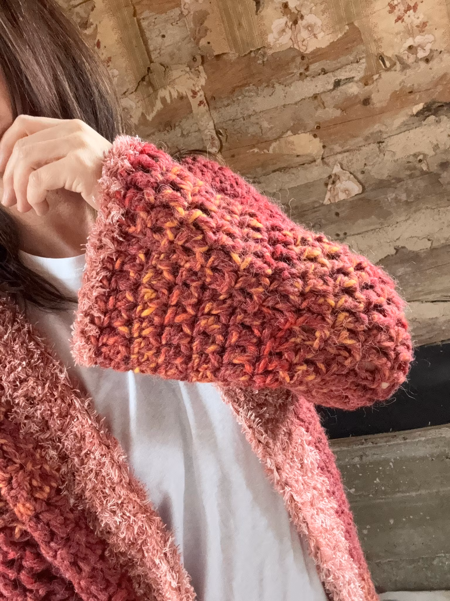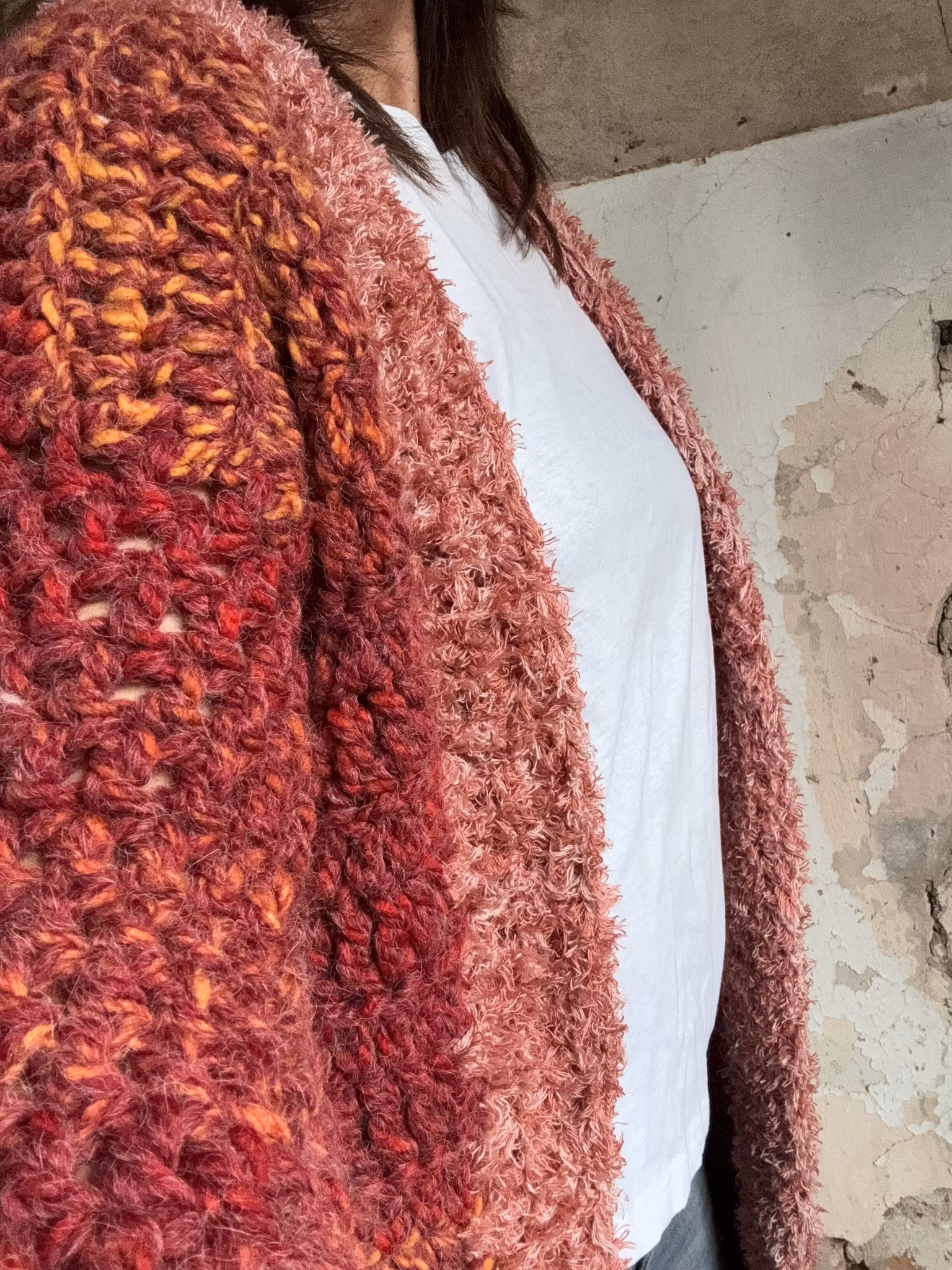 Långkofta med trumpetärm virkad i akryl/alpacka färgen är röd/rost passar S/M