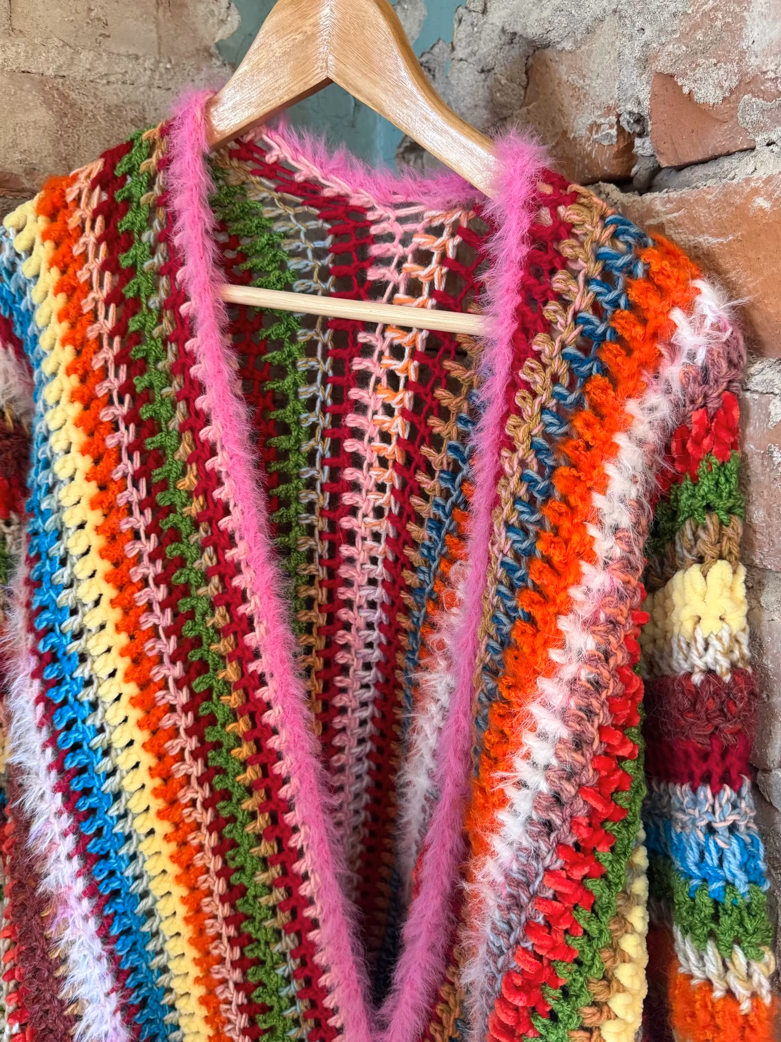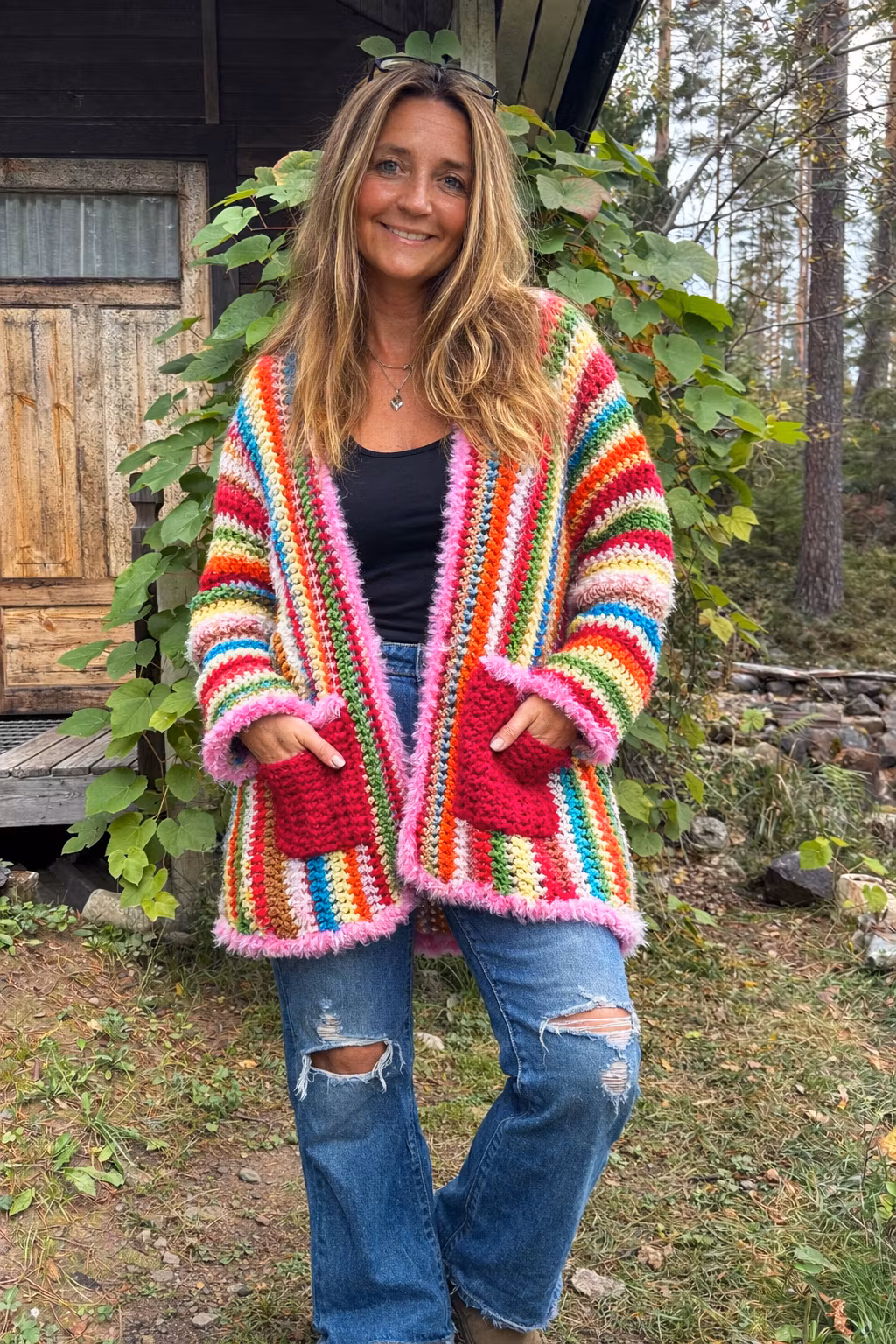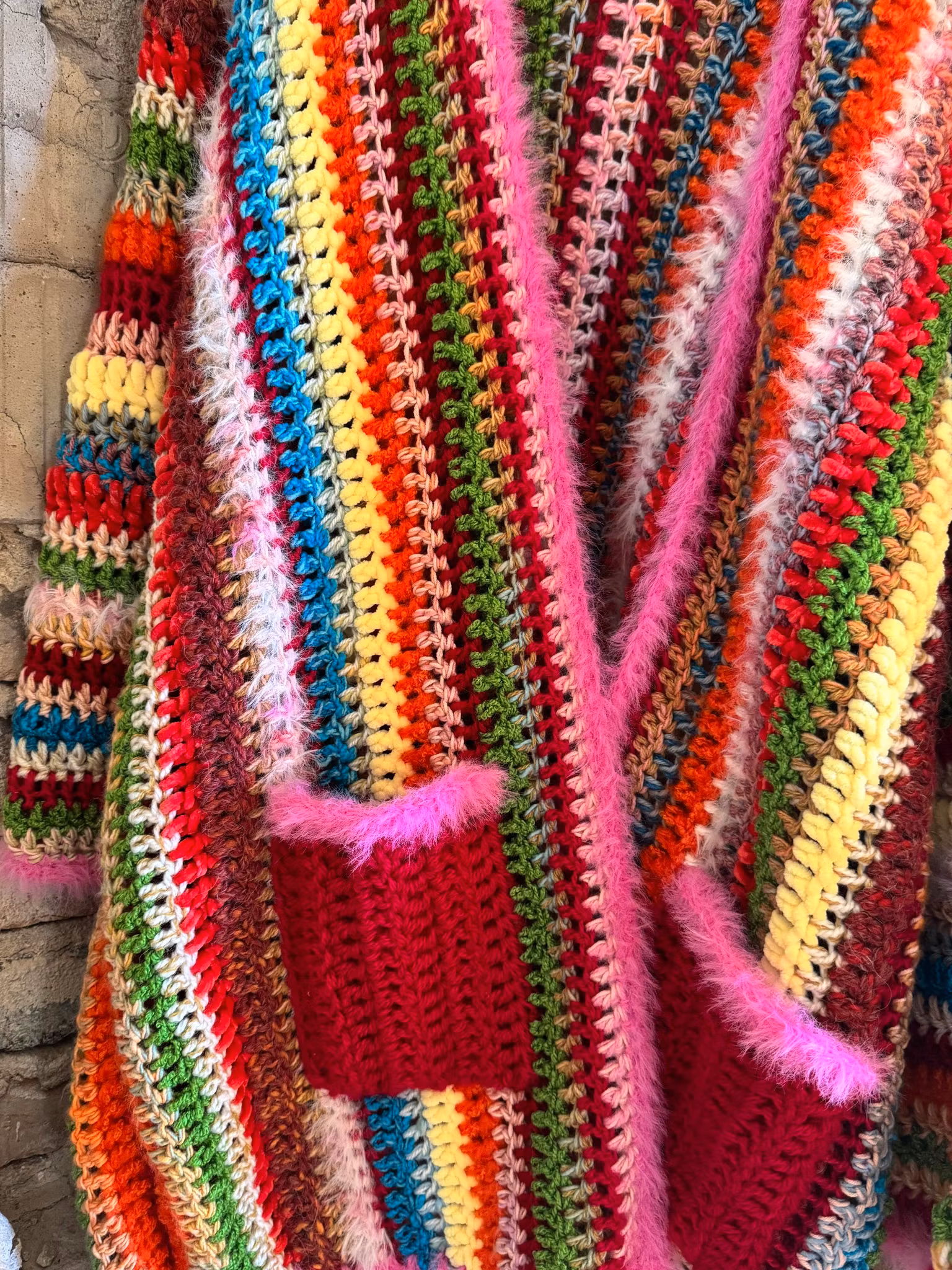 Kofta med stora fickor virkad i blandgarner, ull akryl, polyester,