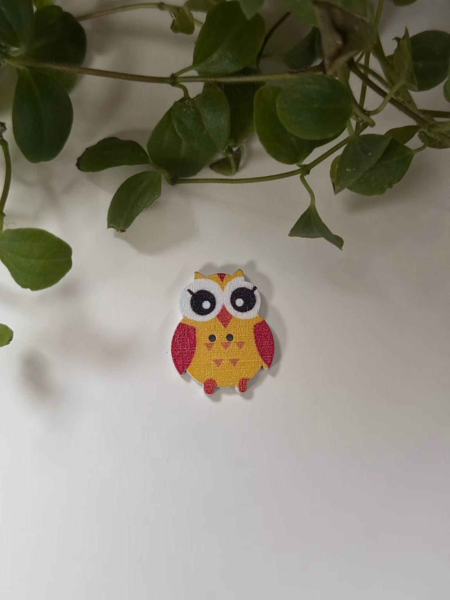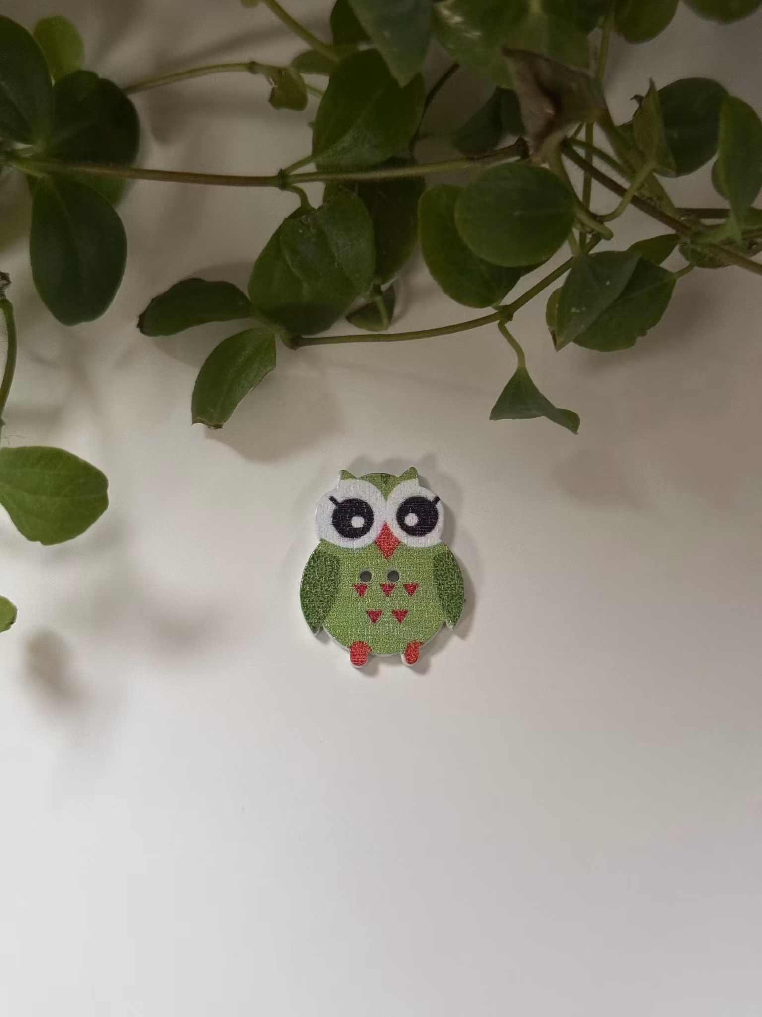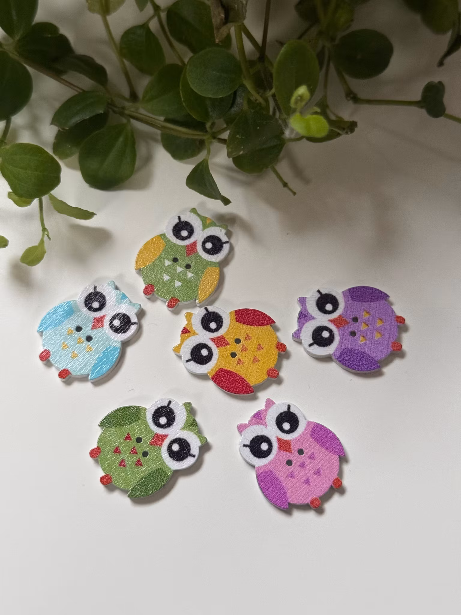 Söta träknappar med 2 hål. Målad framsida och träfärgad baksida. Mått ca 2,5 x 2cm.