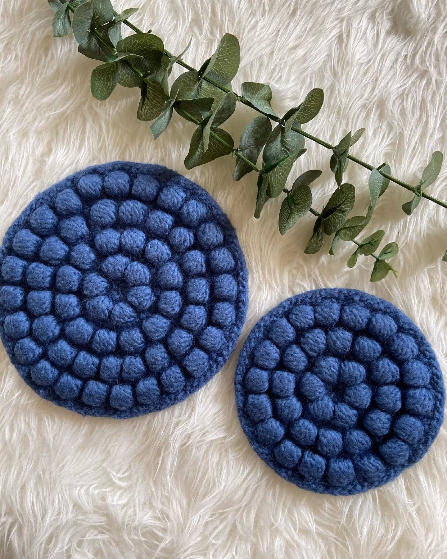 Tovade grytuderlägg virkade i 100%ull . 2pack diameter 18 och 23cm